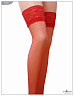 Чулки в мелкую сетку сделаны из нейлона. Чулки плотно облегают ноги, фиксируются с помощью силиконовой манжеты с красной кружевной отделкой.