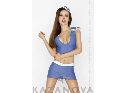 В комплект входят: топ, юбка, галстук, головной убор, спанк и два фаллоимитатора.