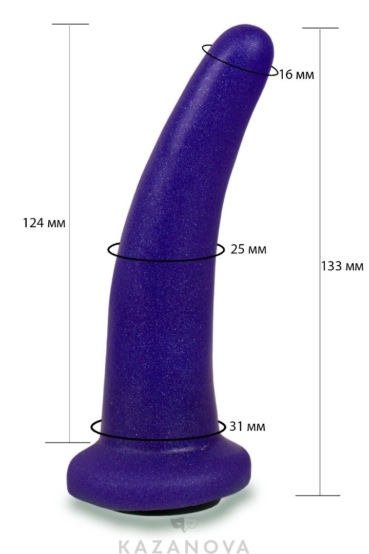 Фиолетовая насадка фиксируется на трусиках или ремнях с помощью кольца и подходит для вагинальной или анальной стимуляции.