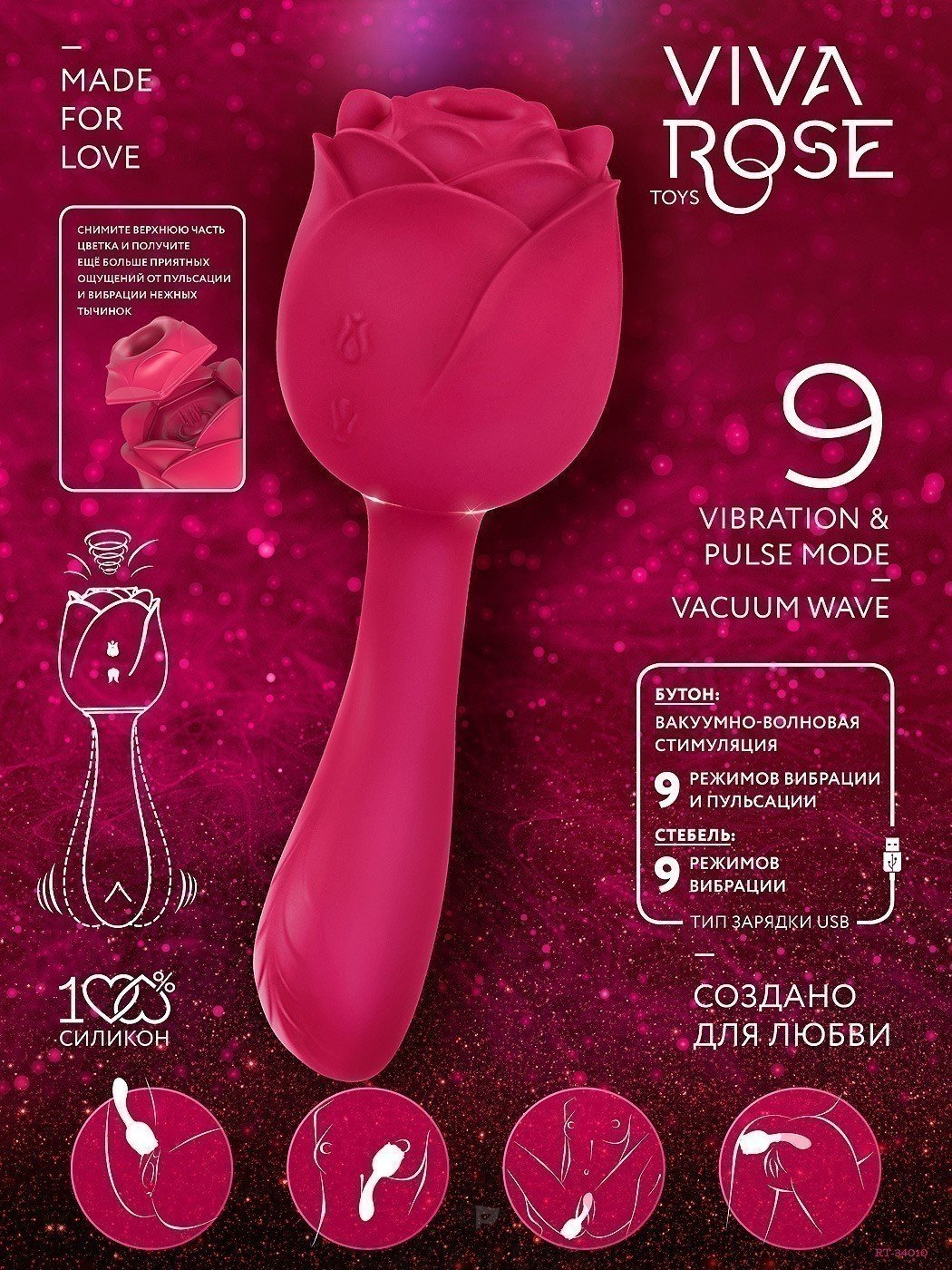 Стебель розы можно использовать как вибромассажёр и, переключая 9 режимов вибрации, получать восхитительные оргазмы.