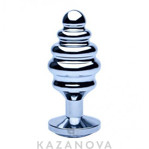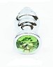 Втулка анальная металлическая большая ребристая серебристая с светло-зеленым стразом 9,3 см